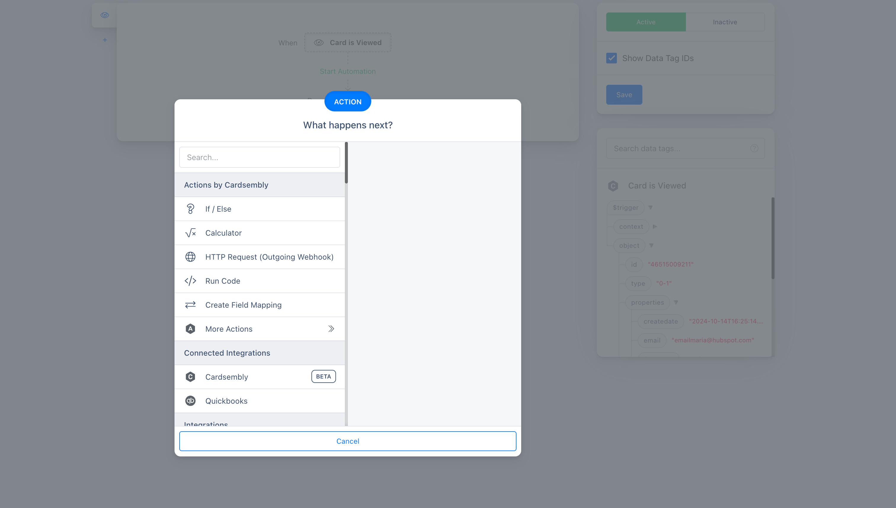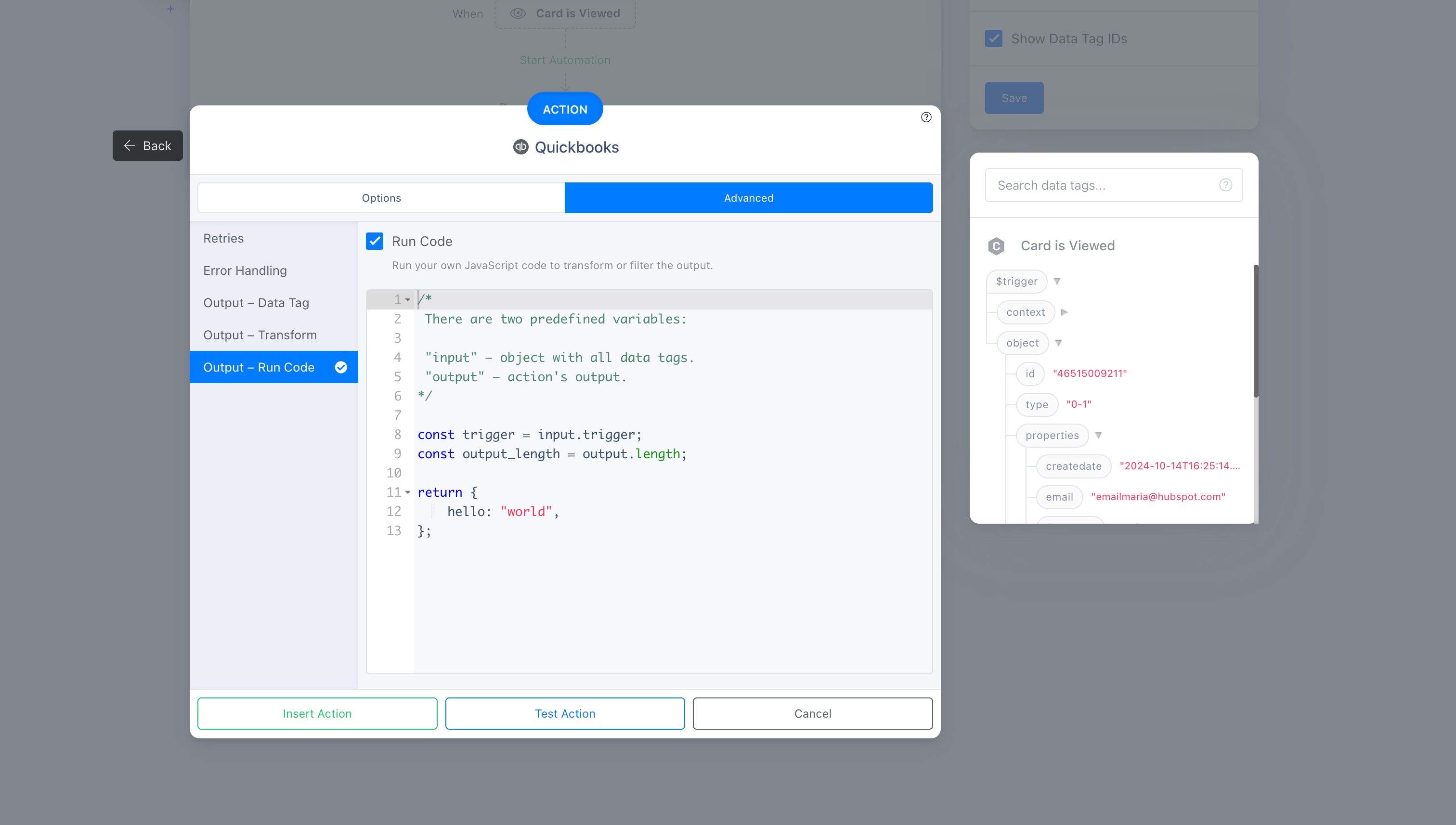 inputis the data that was passed in to the action when it ran, also known as data tags. For example, given you have a card for Contact, and you want to access contact's ID inside code, you can refer to it viainput.trigger.object.id.outputis the result of an action. You have ability to transform your action's output here before it's saved to data tags.